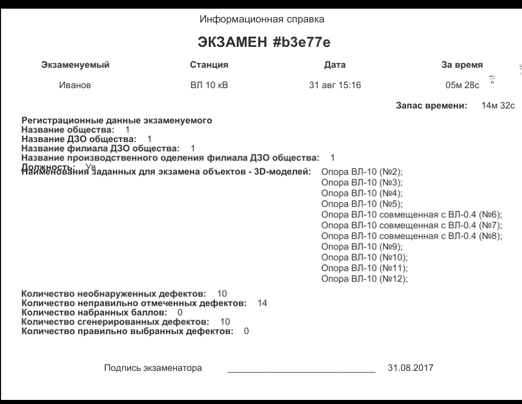 По завершении экзамена показывается время его прохождения, количество начисленных баллов, а также список допущенных ошибок.