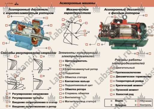 – планшет светодинамический, содержащий: изображение асинхронного электродвигателя с короткозамкнутым/фазным ротором в разрезе с указанием его элементов; мнемосхему, поясняющую принцип действия трехфазного асинхронного электродвигателя; схему замещения АД; схемы включения АД при питании от трехфазной сети и преобразователя частоты; механические характеристики АД; вопросы для автоматизированного тестирования (не менее 20 шт.);