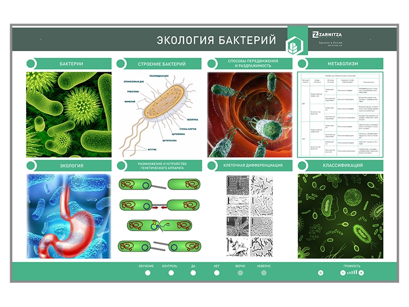 Электрифицированный стенд "Экология бактерий" представляет собой полноцветную светодинамическую панель, на которой представлена информация об экологии бактерий. В конструкцию учебного оборудования интегрированы высокочувствительные сенсоры для управления стендом при помощи интерактивного воздействия приемо-передающих устройств. Предусмотрено два режима работы со стендом: "Обучение" и "Контроль".