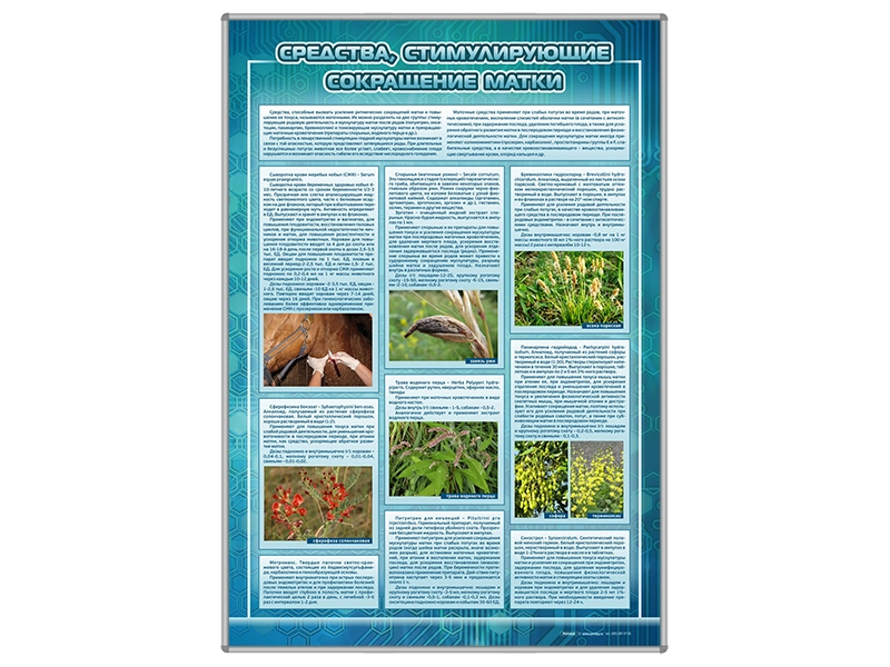 Информационный стенд "Средства, стимулирующие сокращения матки" представляет собой информационную панель, на которой наглядно показаны средства, стимулирующие сокращение матки, с пояснениями.