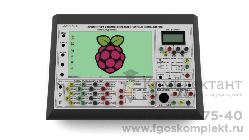 Модуль «Архитектура и применение моноплатных компьютеров» является одним из важнейших частей стенда и одним из его модулей. Модуль содержит в себе моноплатный компьютер Raspberry Pi модель B+. Лицевая панель модуля условно делится на несколько логических блоков. Наименование каждого блока приведено ниже.