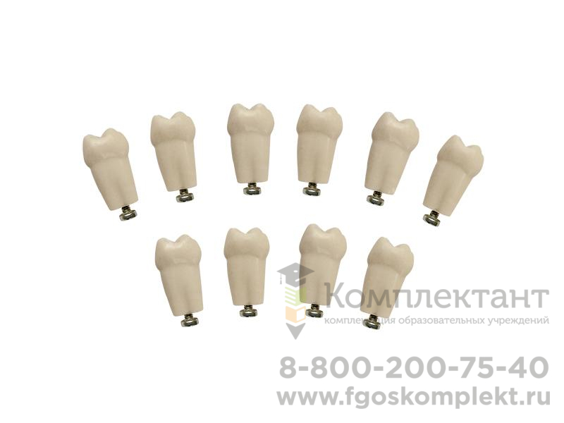 Комплект из 10 модельных зубов одного номера естественной формы с винтовым креплением для установки в денто-модель ЧВН-32А. Материал зубов по своим физическим характеристикам максимально приближен к естественным.