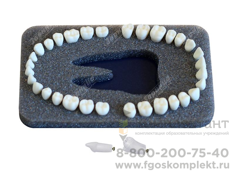 Комплект из 32 модельных зубов естественной формы с винтовым креплением для установки в денто-модели ЧВН-32. Материал зубов по своим физическим характеристикам максимально приближен к естественным.