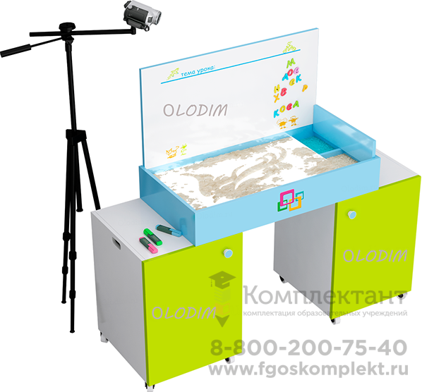 Комплекс педагога так же, как и столы для детей, имеет планшет для рисования песком и песочной анимации, отсеки для песка, формочек и игрушек. Крышка у стола откидная и имеет маркерную поверхность. Столешница с рабочей зоной располагается на двух тумбах, которые для работы сидя раздвигаются в стороны. Ящики в тумбах разбиты на соответствующие ячейки, в которых хранится содержимое всех модулей, входящих в состав комплекса.